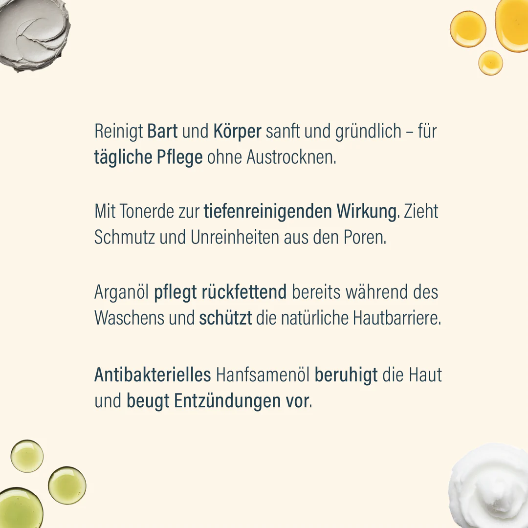 - Die zugesetzte Tonerde saugt Verschmutzungen wie ein kleiner Staubsauger aus deinem Bart und den Poren deiner Haut.