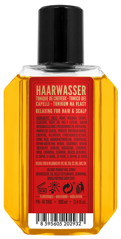 Das DON DRAPER Hair Tonic Gold hat überraschend gute Stylingeigenschaften. Die enthaltenen Öle machen die Haare nicht fettiger, sondern sorgen dafür, dass die Kopfhaut gut durchfeuchtet und die Haare formbar und geschmeidig bleiben. Keratin sorgt für schönen Glanz und erhöht die Widerstandskraft der Haare. Allantoin verringert die Talgproduktion der Kopfhaut, während Salbeiextrakt die Blutzirkulation anregt, das Haarwachstum fördert, reinigt und gegen Schuppen hilft. Das DON DRAPER Hair Tonic Gold ist ein exzellentes Haarwasser oder Prestyler vor der Verwendung von Pomade.
